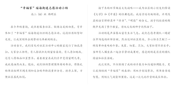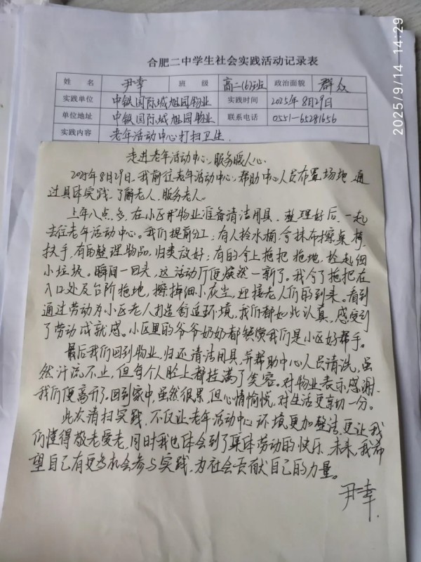 同学们还走出家庭,融入社会。韩明乐在瑶海区幸福家社会服务中心参与家庭读书会志愿服务;尹幸在中铁国际城小区老年活动中心打扫卫生;高欣悦在烟墩街道西杭社区参与公共设施安全巡查;周子煊在大杨镇草堂社区参加“学子传温情,敬老暖人心”关爱老人活动;李祺浩在包河区滨湖世纪社区看望独居老人;王仲宇在三里街街道凤阳一村社区参加庆祝八一建军节志愿服务……这些活动是新时代少年践行公益、担当责任的生动体现。