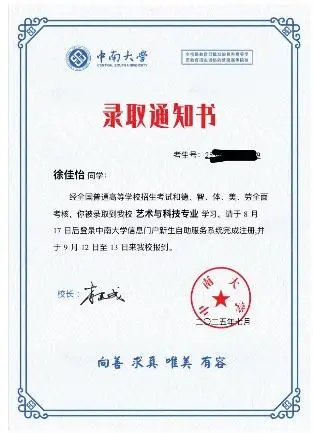大家好,我是合肥二中2025届14班的徐佳怡。在2025年的艺考中,我的专业成绩排名全省第49,综合排名第68,最终有幸被中南大学录取。当我拿到录取通知书,看着那承载努力与梦想的红色信封,集训的日日夜夜、文化课冲刺的拼搏,都如电影画面般在脑海中回放。追梦之路从来不是一帆风顺的,其中有汗水、沮丧和迷茫,更有老师和同学们给予的温暖陪伴。特别感谢合肥二中14班的班主任涂静老师及各科老师,为我高中三年的学习生活答疑解惑,关注我在校的点点滴滴,指引我不断前行。
