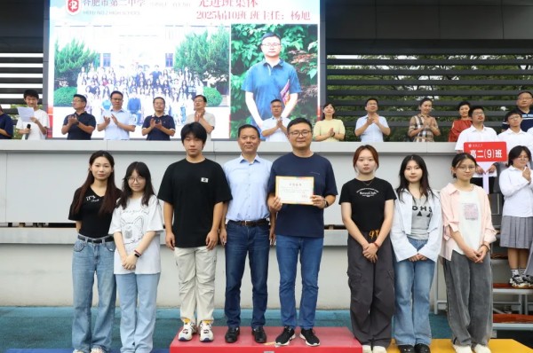 校党委书记苏卫兵为合肥市“先进班集体”(2025届10班、班主任杨旭)颁奖