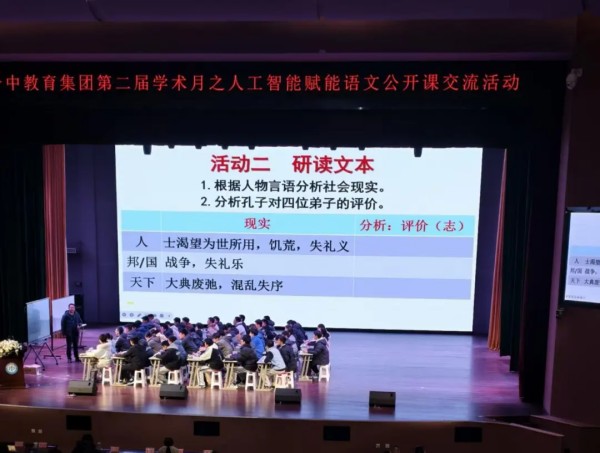 合肥一中江文达老师以“AI搭建支架,解读‘礼’之本质”为任务,借助DeepSeek等智能工具从《论语》中检索与“礼”相关的语句,引导学生通过小组合作,分析文中弟子之志中“礼”的体现;贵阳一中黄开春老师则运用豆包等人工智能平台,为学生提供课前助读资料,并在课堂上组织“怀天下抱负,做未来主人”主题演讲比赛,围绕“孔子对四位弟子的评价”展开互动探究,鼓励学生结合所学现场撰写并展示演讲稿,令传统课堂焕发新生机。两节公开课风格各异,既紧扣经典文本的核心内涵,又展现了AI赋能下文言文教学的新路径。