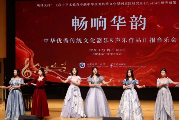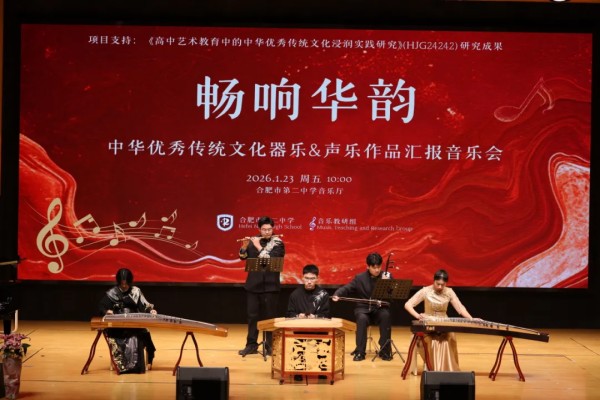 2026年1月23日上午,合肥二中音乐厅内器韵悠扬,歌声清越,《畅响华韵——中华优秀传统文化器乐、声乐作品汇报音乐会》暨市级课题《高中艺术教育中的中华优秀传统文化浸润实践研究》(课题编号:HJG24242)成果展示活动在此隆重举行。中国音乐家协会会员、安徽艺术学院特聘教授罗可曼教授,合肥二中校长田先科等嘉宾莅临现场,与师生、家长齐聚一堂,共同见证了一场融合艺术展示、文化传承与思政教育的音乐盛会。