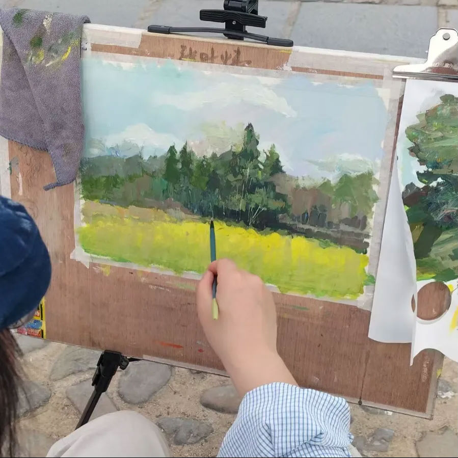 我们踩着沾着晨露的青石板,在田埂上架起画架。脚下的泥土软乎乎的,混着油菜花的甜香往鼻尖钻。大家一笔一画,细细描摹,将朝阳的金辉与花田的烂漫稳稳落在纸上。风拂过花浪沙沙作响,与笔尖划过纸页的轻响相融,这便是最生动的课堂。