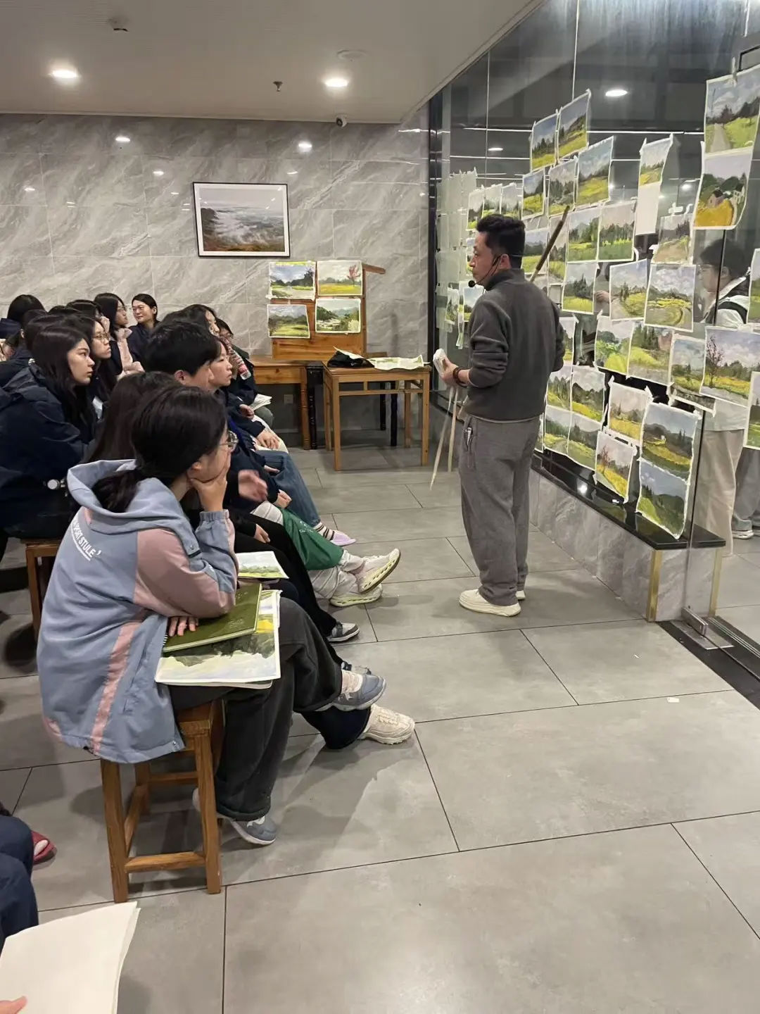 老师逐一点评,细致耐心、条理清晰,从构图到色彩、从线条到意境都悉心讲解。同学们凝神静听,认真记录,时而低头对照,时而抬头专注望向老师,整个现场安静专注,求知氛围浓厚。