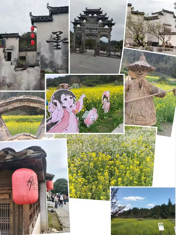 漫步其间,看马头墙错落有致,赏木雕石雕精巧细腻,处处皆是入画景致,仿佛一脚踏进了一幅沉静的水墨长卷。遍地黄花开遍,金浪翻涌,稻草扎成的人物憨态可掬,与花海相映成趣,别有一番田园野趣。