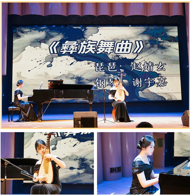 随后,音乐会在悠扬婉转的琵琶声中正式拉开帷幕。赵婧玄同学带来琵琶独奏《彝族舞曲》,谢宇嘉同学倾情钢琴伴奏,灵动的弦音流淌出浓郁的民族风情,清脆的琴音与婉转的琵琶交织,为“古韵流芳”篇章奏响了惊艳开篇,瞬间将现场观众带入唯美的艺术境界。