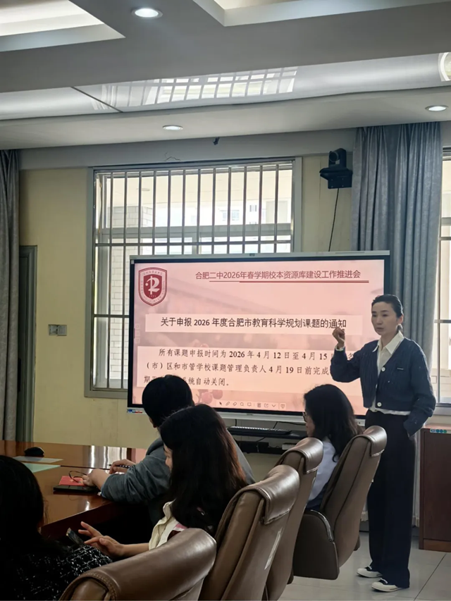 为深入推进学校教育教学改革,规范校本资源研发与应用,4月10日,合肥二中召开2026年春季学期校本资源库建设工作推进会。教科研处主任徐晓华、各教研组组长参会,会议围绕资源库建设标准、任务分工、时间节点及配套工作安排进行全面布署。