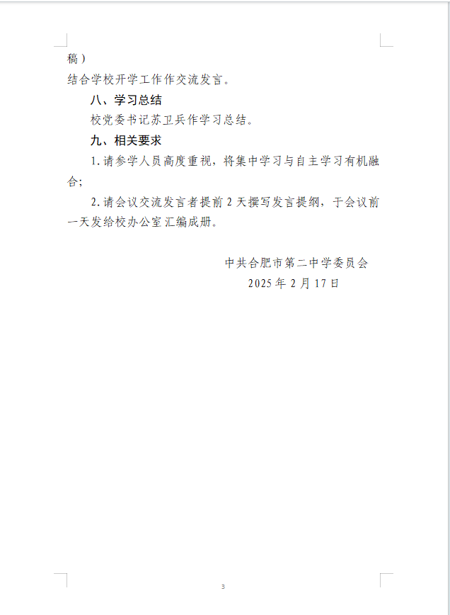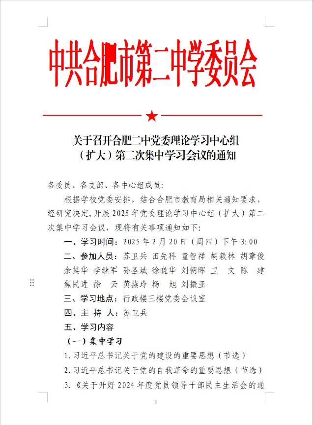 关于召开合肥二中2025年党委理论学习中心组(扩大)第二次集中学习会议的通知