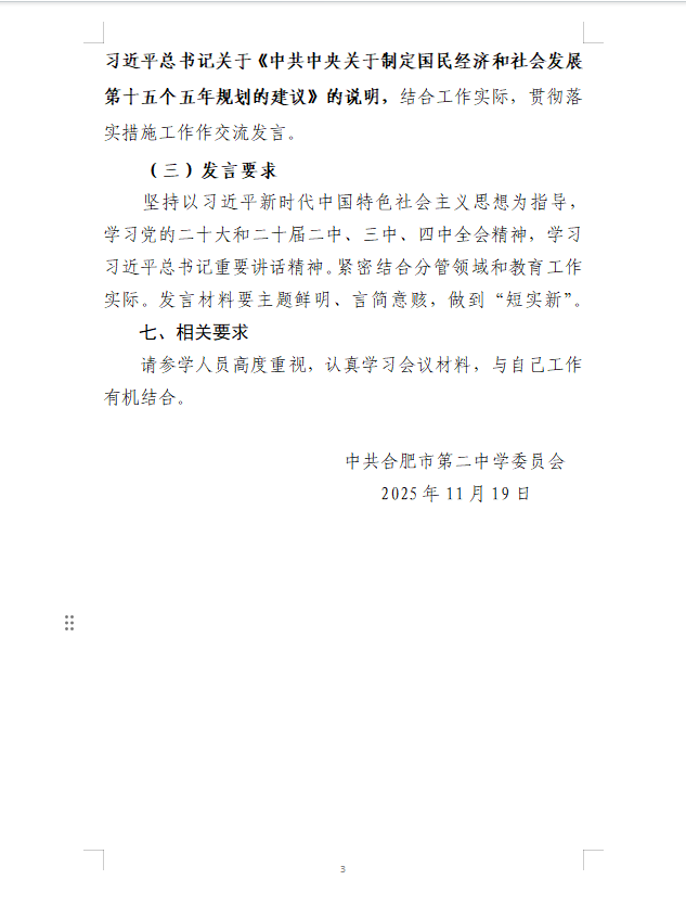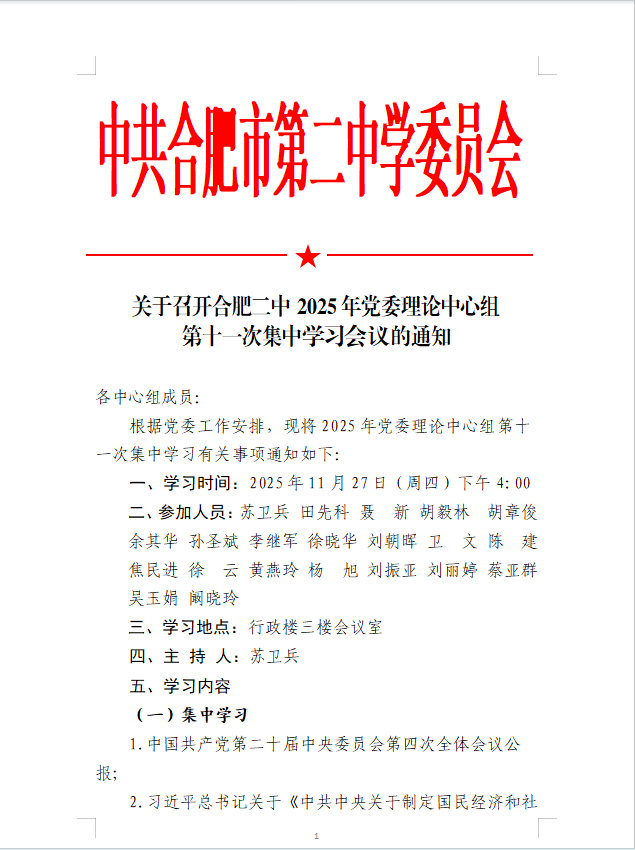 关于召开合肥二中2025年党委理论中心组第十一次集中学习会议的通知