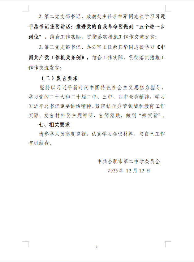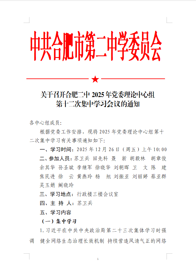 关于召开合肥二中2025年党委理论中心组第十二次集中学习会议的通知