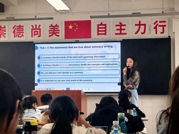 活动伊始,赵昕蓓老师带来了一节高一Unit 7《Art》的摘要写作教学公开课。赵老师以流利的口语表达、清晰的教学设计和自然的课堂互动,展现了“以生为本”的教学理念。课堂通过任务驱动与讲练结合,引导学生逐步掌握摘要写作技巧,提问环节注重启发性,反馈及时且精准,教学目标达成度高。评课环节中,教师们一致肯定了赵老师对学生输出的有效引导,并提出在课堂总结部分进一步强化学生自主表达的建议,以增强课堂生成性。
