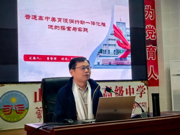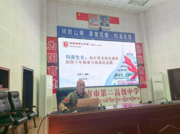 合肥市第二中学校党委委员、副校长童智祥在山南二高的会议厅做《普通高中美育浸润行动一体化推进的探索与实践》报告,从合肥市第二中学以美立校、向美而行、美美与共三大路径体系展开介绍。基于39年美育浸润实践经验,结合新时代育人要求与现存问题,合肥二中将以“系统优化、机制赋能、空间拓展”为三大抓手,持续深化美育特色办学实践,推动普通高中美育从“特色探索”向“范式输出”升级。