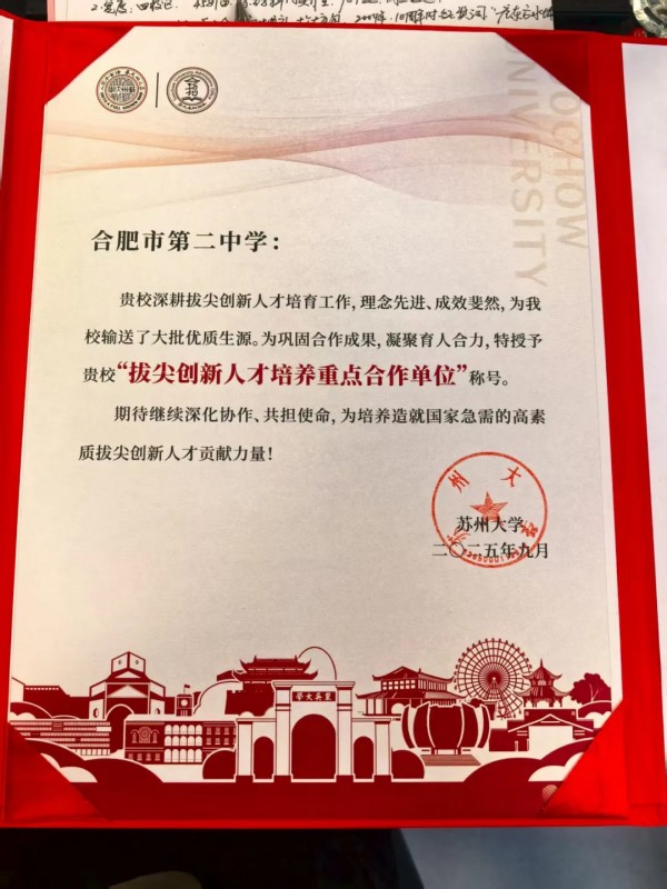 会上,为感谢合肥二中持续为苏州大学输送优质生源及在拔尖创新人才培养方面作出的突出贡献,苏州大学党委常委、副校长查佐明代表学校向合肥二中颁发了苏州大学拔尖创新人才培养重点合作单位证书。这一荣誉不仅体现了苏州大学对合肥二中办学质量和育人成果的高度认可,也彰显了合肥二中作为安徽省艺术特色强校的示范地位。
