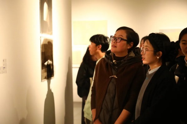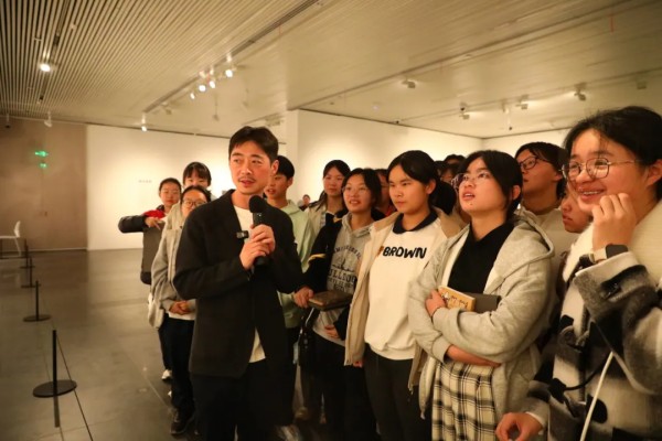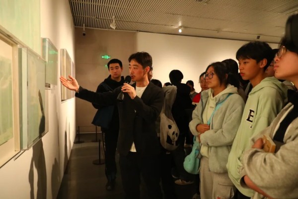 在艺术家导览环节,汪晟引领师生沉浸于作品构建的“时间”场域中。他耐心解读每件作品的创作背景、材料运用与观念表达,讲述“褶皱”如何象征被压缩的历史与记忆,“缝隙”如何成为窥见未知与通道,而“永恒”又如何在这些细微的瞬间得以凝固。