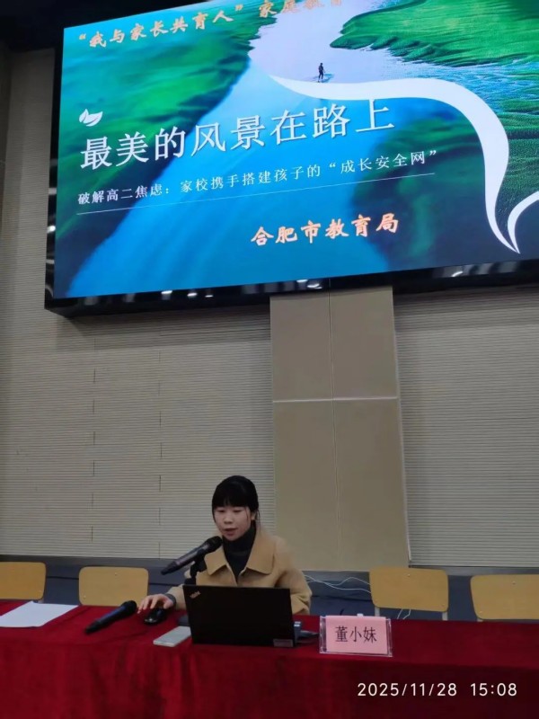 11月28日下午,合肥二中2025年秋季学期高二年级家长学校活动在校内有序开展。本次活动以“家校共育 立德树人”为主线,通过集中学习与分班研讨相结合的形式,搭建了家校双向沟通的坚实桥梁,共同助力高二学子平稳度过关键成长期。