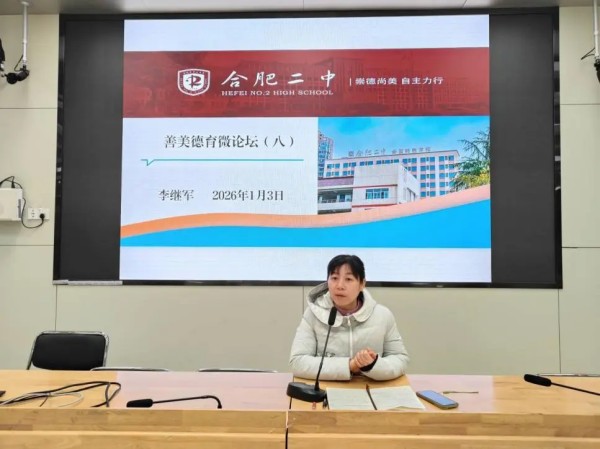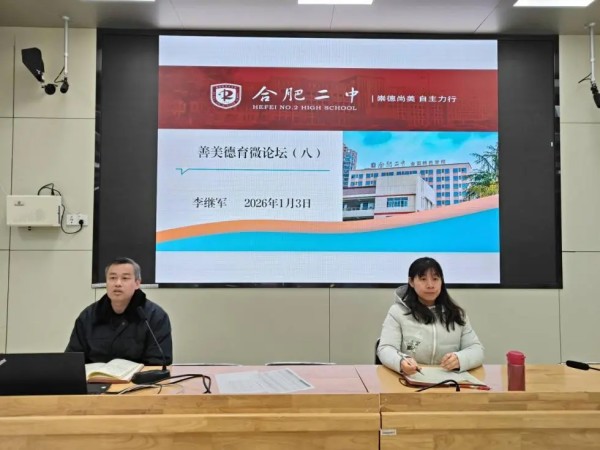 2026年1月3日,合肥二中在善美德育体系建设背景下,成功举办了第八期善美德育微论坛。此次会议由政教处主任李继军主持,校党委委员、副校长胡毅林以及全体班主任和全体生活老师参与会议。