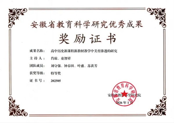 此次特等奖的斩获,既是对合肥二中“教研创新驱动教学革新” 理念的印证,也彰显了两校合作教研的协作价值。该课题的核心创新,在于首次以跨校协同的方式,将历史学科的 “人文性” 与美育的 “审美性” 深度绑定,形成了 “理论架构 + 资源支撑 + 课堂落地” 的完整美育模式,不仅优化了两校历史课堂生态,更为全省高中历史新教材的美育实施提供了原创性的实践范本。