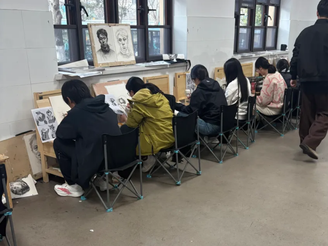 首先,课前进行了画具整理、教学示范准备与课堂秩序梳理,帮助同学们快速进入绘画状态,为后续素描教学的规范性与课堂效率奠定基础。在素描基础学习环节,从人物头像结构、明暗关系开始分步讲解:明确观察方法、线条运用与光影塑造要点,强调构图稳定、比例准确,配合坐姿调整、画板角度规范要求,循序渐进地从基础线条过渡到完整头像绘制,让同学们逐步掌握素描观察方式与绘画步骤。