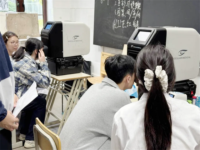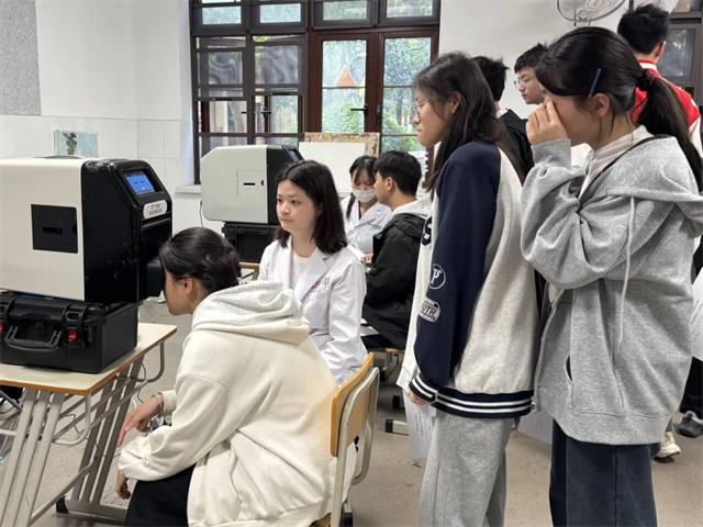 监测现场秩序井然,专业医护人员携带先进设备,严格按照规范流程为学生进行视力检查。各班级学生在老师组织下安静排队、分批参检,积极配合,展现出良好的纪律风貌。