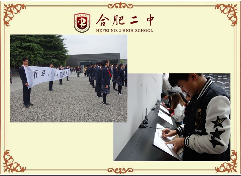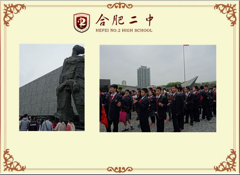 前事不忘,后事之师。在历史的照片和累累白骨前,同学们上了一堂生动而又深刻的历史课,领悟了革命先烈们捐躯报国的碧血丹心。在万人坑,凭吊无数死去的南京同胞;在纪念碑前,聆听革命烈士的壮烈故事。高一(6)班周新承同学在纪念馆留言簿留言:犯我中华者,今必诛回之,让我们感受到中华青年学子的爱国情怀。紧接着,合肥二中学子观摩了南京市第一中学全体学生的缅怀先烈的祭拜活动。