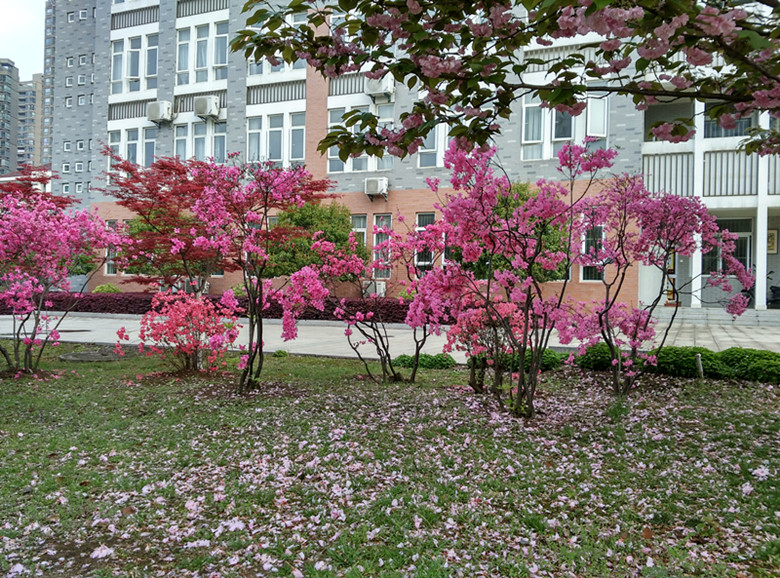 有着五瓣花瓣、颜色浅粉的樱花在古代也被诗人称赞“三月雨声细,樱花疑杏花”,这是白居易的诗,同时樱花也被日本当作国花。樱花源自中国,早在秦汉时期就有官员种植樱花,可见其深远的影响力。在今年四月樱花开放时,校园似乎被染上了一层粉红,显得美丽而柔软。这嫩枝与绿叶、粉瓣黄蕊的樱花,真是漫步校园时一道独特的风景线。