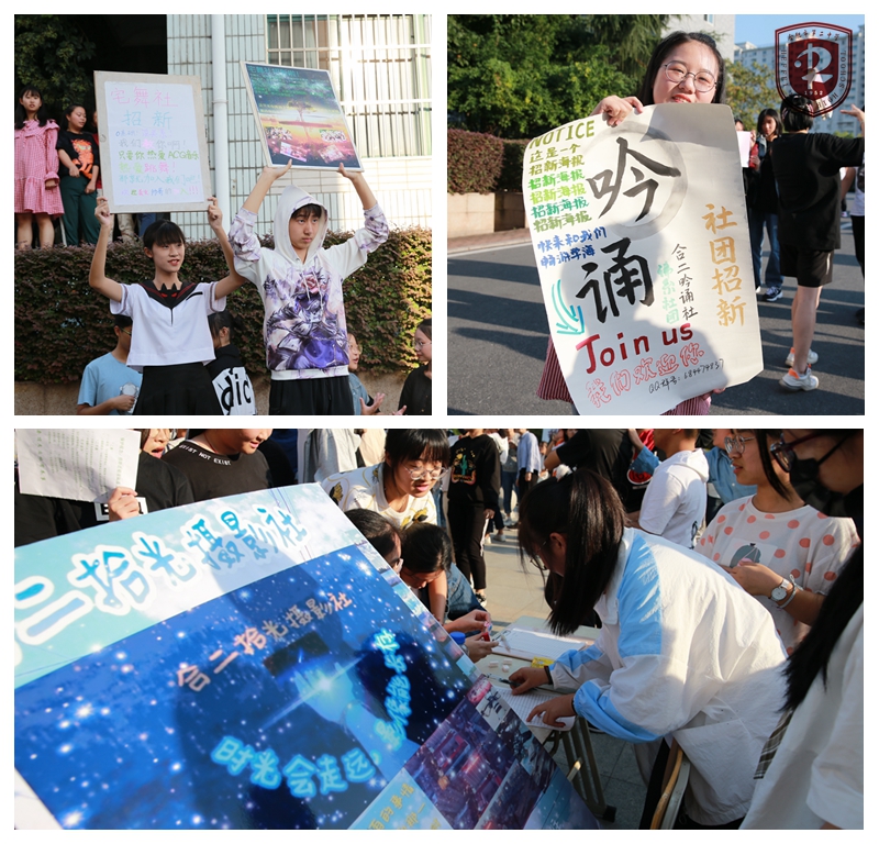 为了调动新生的积极性,更好地开展社团招新工作,活动现场,社员们用自己社团特色吸引高一新生的眼球。街舞社、宅舞社同学跟着节奏跳地精彩万分,获得同学们喝彩声;学生会、广播站更是吸粉无数;还有国学社的同学们穿上古装,配上毛笔书法字,精彩纷呈……各社团负责人使劲吆喝呼喊,期待新生亲情加盟。