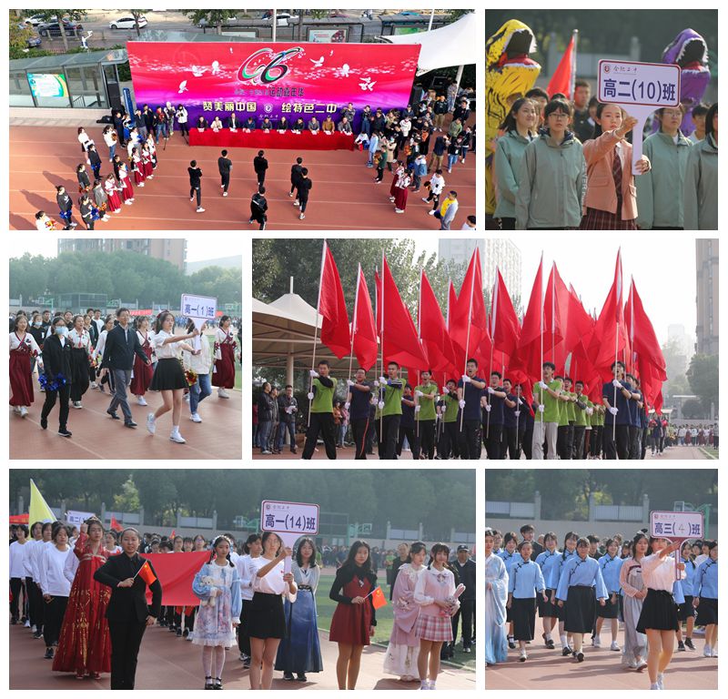 开幕式在进行曲中拉开帷幕,首先入场的是国旗护卫队,他们步伐整齐,精神抖擞,气宇轩昂,彰显二中师生勇往直前的精神风貌。国旗、校旗、会徽、花球方阵陆续入场。口号响亮的各班方阵,精神抖擞、步伐统一地经过主席台,接受检阅。他们朝气蓬勃,演绎青春的律动,秀出年轻的风采,展现了二中学子的多才多艺。许多班级别出心裁,有的载歌载舞;有的盛装穿着;有的扮成卡通动漫人物出场,赢得掌声雷鸣。
