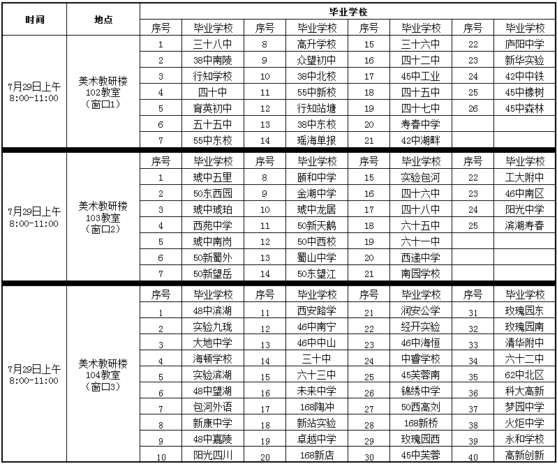 7月29日全天,学校美术教研楼(如下图所示)一楼102、103、104室。