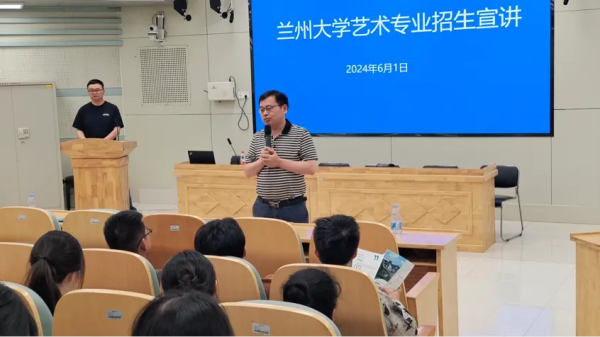 随后,卲强军老师面向师生做“2024艺术类招生政策解读”。首先以学院办学模式、基础设施建设、师资力量、发展前景、报考政策变化以及入学后的各项政策等方面入手,向师生介绍了兰州大学的办学特色和优势,同时就很多人关心的双证颁发条件及证书性质进行了重点讲解。最后通过一段宣传视频完整展示了兰州大学校园风景以及学院设施状况,收获一片好评。