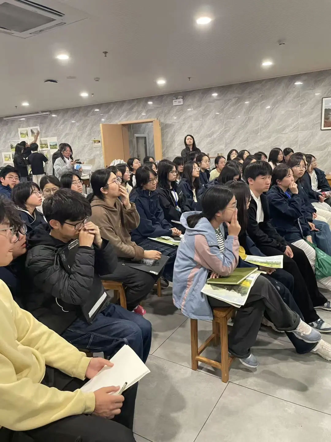 老师逐一点评,细致耐心、条理清晰,从构图到色彩、从线条到意境都悉心讲解。同学们凝神静听,认真记录,时而低头对照,时而抬头专注望向老师,整个现场安静专注,求知氛围浓厚。