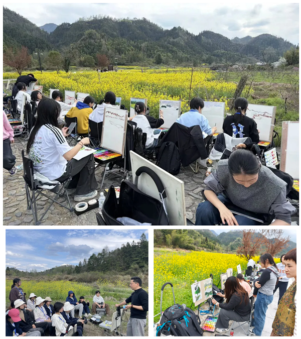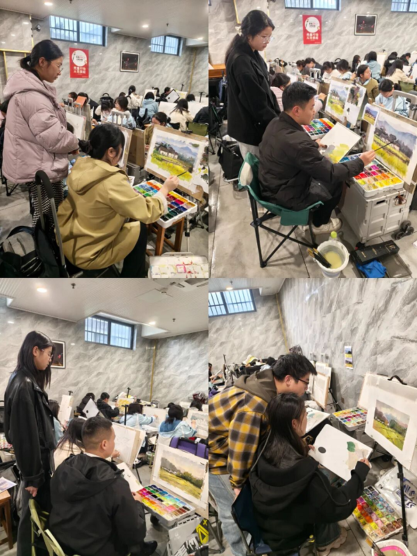 粉墙黛瓦、春日景致,构成最美的天然课堂。专业教师现场示范指导,从取景构图到色彩运用,从光影捕捉到艺术表达,手把手助力学生提升专业能力。同学们静心观察、潜心创作,在实景实践中将知识转化为技能,在人文山水间提升艺术素养。