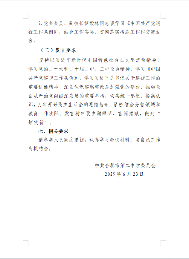 关于召开合肥二中2025年党委理论中心组第六次集中学习会议的通知