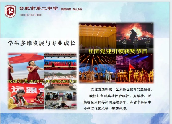 作为全国特色学校,历经39年沉淀,合肥二中已形成“臻美课程”体系,在普通高中多样化发展浪潮中树立鲜明标杆。自1986年首创美术特长班,1995年开设整建制音乐班,2021年开设舞蹈特长班,目前学校逐步构建以美术、音乐、舞蹈为主体,表导演、书法、播音主持为补充的特色教育体系,先后获评为“全国特色学校”“安徽省示范高中”“安徽省首批中华优秀传统文化传承学校”,2022年挂牌“安徽艺术学院附属合肥市第二中学”,2023年成为“合肥市五育融合示范校”并对口帮扶肥东县众兴中学,2024年荣获全市唯一“艺术类特色学校”称号,跻身全省高质量特色教育示范窗口行列。