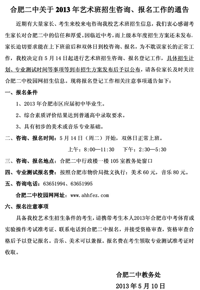 合肥二中关于2013年艺术班招生咨询、报名工作的通告