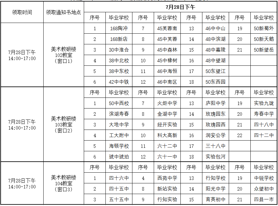 由于今年领取录取通知书、新生资格审查及报到一并进行,人数较多,为避免交通拥堵,特结合我校不同录取批次和不同毕业初中进行人员分流,请家长和学生根据下方时间安排表前来学校。