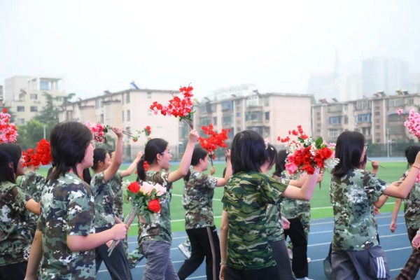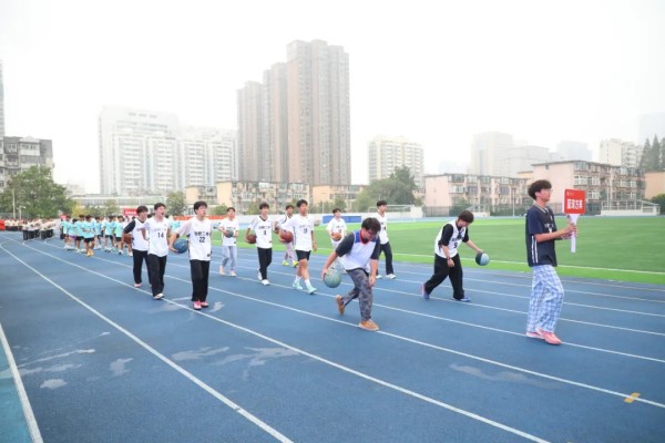 由同学们组成的红旗队迎风奔跑,猎猎红旗如火焰般燃烧;鲜花队与花球队的队员们笑容灿烂,用色彩与活力点亮了整个赛场。