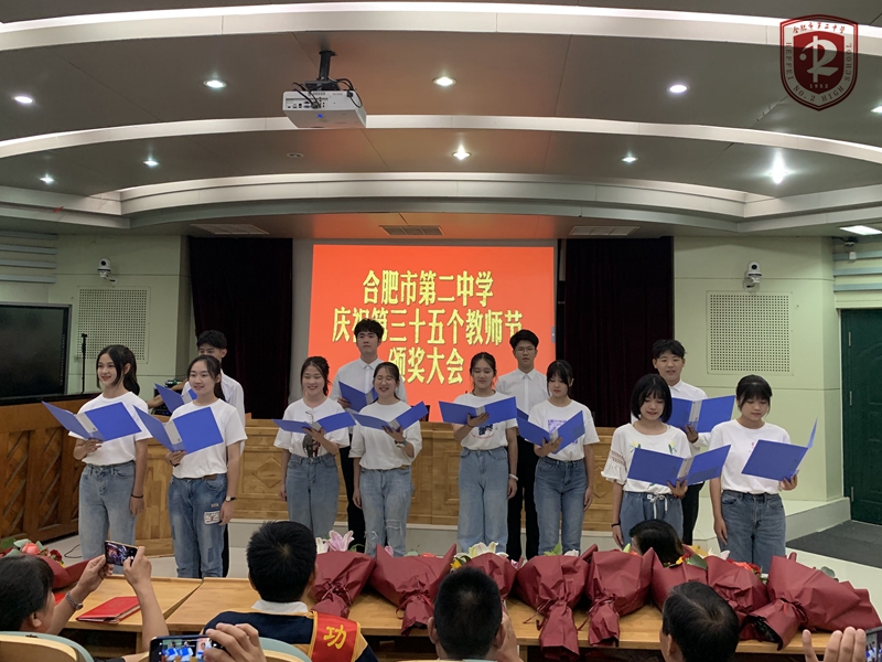 学校庆祝教师节颁奖大会当天,我们的节目在中场,同学们出色地完成了任务,用深情、整齐、铿锵的美妙声调,用大方、得体、舒展的肢体语言,征服打动了在场观众。在阵阵掌声中完美谢幕,用普通话诵读方式向老师们道一声“感谢”,说一句“节日快乐”!