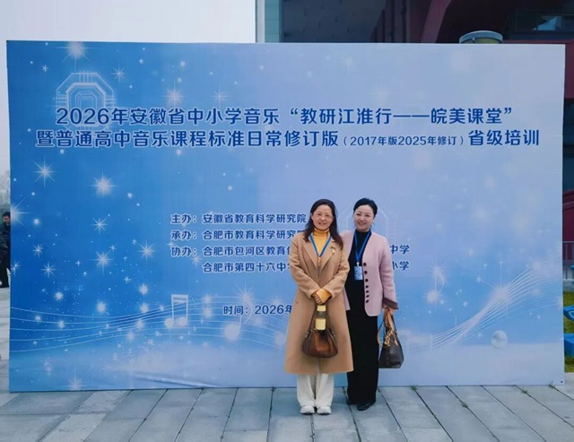 2026年3月22日-25日,由安徽省教育科学研究院主办的2026年安徽省中小学音乐“教研江淮行——皖美课堂”暨普通高中音乐课程标准(2017年版2025年修订)省级培训活动在合肥圆满举办。本次活动以“AI赋能音乐教学”为主题,分小学、初中、高中三个学段同步开展,汇聚省内外音乐教育专家、各地市教研员与一线骨干教师,搭建起理念碰撞、实践交流、课标研讨的高品质教研平台。作为合肥市音乐特色学校,合肥二中音乐教研组长刘畅、高级教师吴海燕受邀全程参训,借力省级高端研训汲取前沿养分,为学校深化音乐特色办学、优化常规音乐课与音乐专业课衔接融合蓄力赋能。