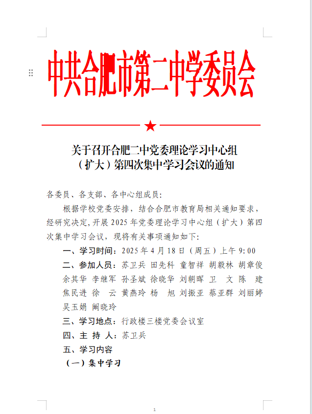 关于召开合肥二中2025年党委理论学习中心组(扩大)第四次集中学习会议的通知