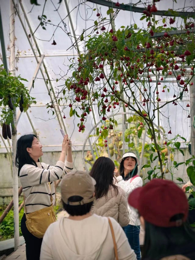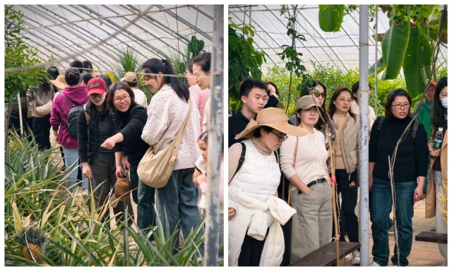 随后,队伍移步至尊贵现代农业科技园。在热带果林馆,大家仿佛穿越到了东南亚热带丛林——近400种热带果树、千姿百态的仙人掌、色彩斑斓的鹦鹉和蝴蝶标本,让人目不暇接。大家还走进蔬菜工坊,近距离观摩全自动水肥一体数控中心、机械化培植育苗温室以及鱼菜共生生态循环系统。这些现代农业的“黑科技”让老师们大开眼界,纷纷感叹科技为农业插上了腾飞的翅膀。紧接着,老师们来到萌宠乐园,与小动物们近距离互动,感受人与自然的和谐相处。