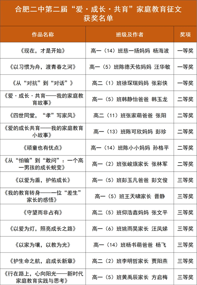 为深入贯彻《中华人民共和国家庭教育促进法》文件精神,落实立德树人根本任务,推动家校社协同育人走深走实,2026年2月2日-3月6日,合肥市第二中学成功举办第二届“爱?成长?共育——我的家庭教育故事”征文活动。活动聚焦家庭教育主体责任,搭建经验交流与理念共享平台,吸引了全校学生家长踊跃参与,征集优秀作品近百篇,最终精选15篇获奖文章。