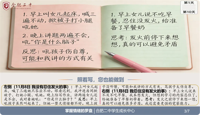 亲爱的家长朋友,今天我们一起学习了处理负面情绪的具体方法。方法不难,关键在于用起来。建议您从今天开始,准备一个本子,连续记录10天情绪觉察日记。10天后,您会发现自己对情绪的掌控力真的不一样了。